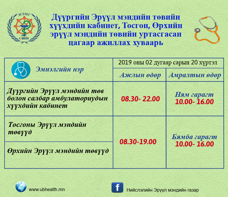 Томуу, томуу төст өвчний цаг үеийн нөхцөл байдалтай холбогдуулан дүүргийн эрүүл мэндийн төв, салбар амбулатори, Өрхийн эрүүл мэндийн төвийн цагийн хуваарьт өөрчлөлт орлоо.