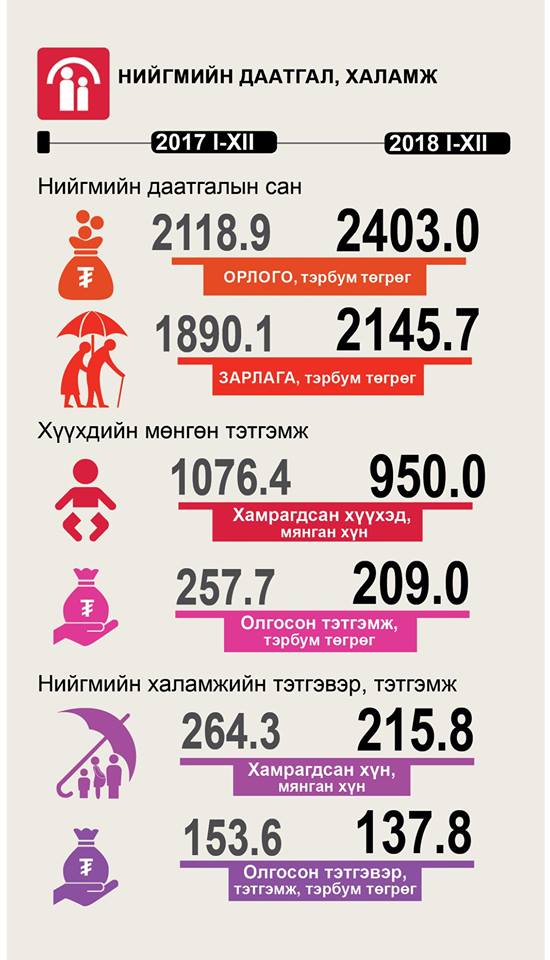 Нийгмийн даатгалын ерөнхий газар, Эрүүл мэндийн даатгалын ерөнхий газрын мэдээллээр нийгмийн даатгалын сангийн орлого 2018 онд 2.4 их наяд төгрөг болж, өмнөх оноос 284.1 тэрбум төгрөгөөр, зарлага 2.1 их наяд төгрөг болж, өмнөх оноос 255.6 тэрбум төгрөгөөр тус тус өсчээ. Нийгмийн даатгалын сангийн орлого нэмэгдэхэд эрүүл мэндийн даатгалын сангийн орлого 57.7 тэрбум төгрөгөөр, ажилгүйдлийн даатгалын сангийн орлого 204.7 сая төгрөгөөр буурсан ч, тэтгэврийн даатгалын сангийн орлого 256 тэрбум төгрөгөөр, үйлдвэрлэлийн осол, мэргэжлээс шалтгаалах өвчний даатгалын сангийн орлого 65 тэрбум төгрөгөөр өссөн нь голлон нөлөөлжээ.