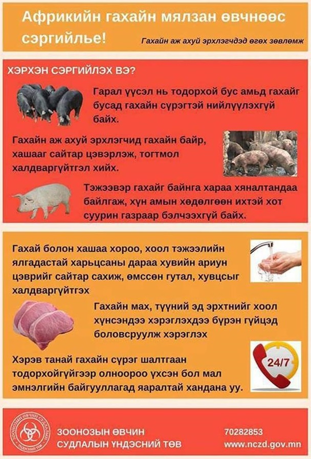 Иймд бусад аймаг, сум, дүүрэг, хорооноос мал, амьтан оруулж ирэхгүй байх, гарал үүсэл нь тодорхойгүй гахайн махыг хүнсэндээ хэрэглэхгүй байх, гахайн мах, түүний эд эрхтэнийг хүнсэнд хэрэглэхдээ бүрэн гүйцэд боловсруулж хэрэглэхийг АНХААРУУЛЖ байна.