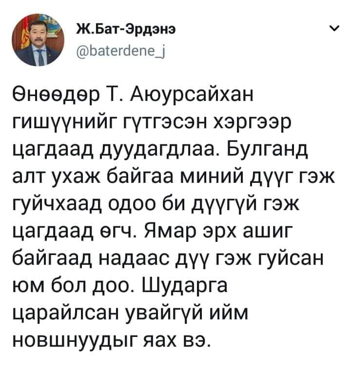 Зам тээврийн хөгжлийн сайд асан, УИХ-ын гишүүн Ж.Бат-Эрдэнэ өөрийн цахим хуудаснаа УИХ-ын гишүүн Т.Аюурсайханд хандаж байр сууриа илэрхийлжээ. Тэрбээр "Өнөөдөр Т.Аюурсайхан гишүүнийг гүтгэсэн хэргээр цагдаад дуудагдлаа. Булганд алт ухаж байгаа миний дүүг гуйчихаад, одоо би дүүгүй гэж цагдаад өгч байна. Ямар эрх ашиг байгаа болоод надаас дүү гэж гуйсан юм бол. Шударга царайлсан увайгүй новшнуудыг яах вэ" хэмээн жиргэжээ.
