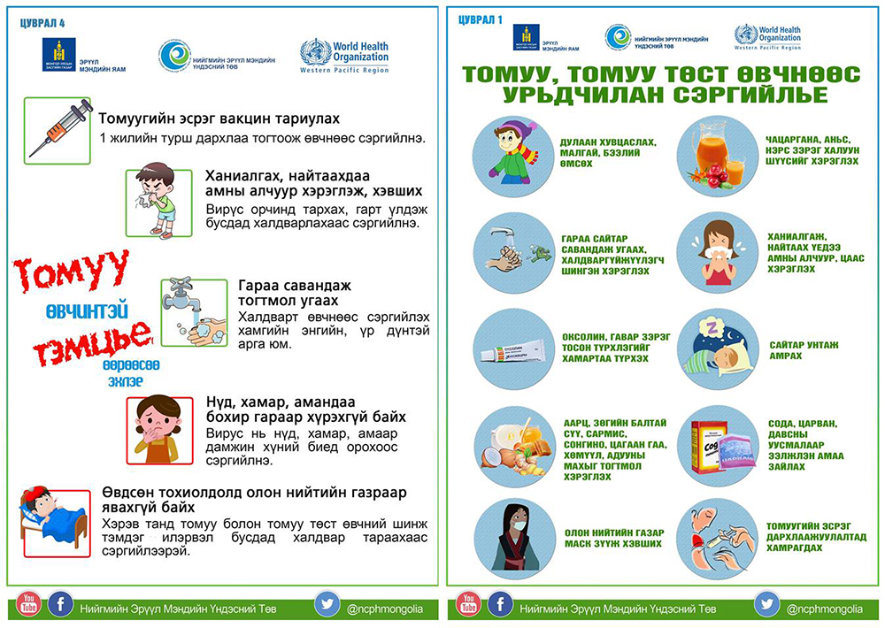 - Гэр, сургууль, цэцэрлэг, ажлын байрандаа цэвэр агаар оруулж, өдөрт чийгтэй цэвэрлэгээг 2-оос доошгүй удаа хийх зэрэг энгийн аргуудыг хэрэглэхээс гадна ТТТӨ-нөөс сэргийлэх үндсэн гол арга бол томуугийн эсрэг сайн дурын дархлаажуулалтанд хамрагдах явдал юм. Тиймээс та бүхэн ХӨСҮТ-ийн сайн дурын дархлаажуулалтын кабинетаар үйлчлүүлээрэй. Ялангуяа 2-15 хүртэлх насны хүүхэд, өндөр настан, уушгины архаг суурь өвчтэй хүмүүс хамрагдвал илүү ач холбогдолтой.