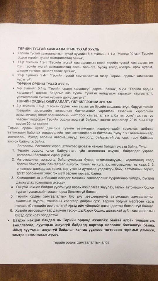 Төрийн тусгай хамгаалалтын газрын дарга П.Батаагийн шийдвэрээр 2019.01.20-ноос эхлэн ийнхүү Ерөнхийлөгчийн Тамгын газар, УИХ-ын Тамгын газар, Засгийн газрын Хэрэг эрхлэх газарт ажилладаг төрийн албан хаагчдын автомашиныг Төрийн ордны авто зогсоолд байрлуулахыг хориглосон байна. Ингэснээр дээрх 3 байгууллагын 600 гаруй ажилтан ажил үүргээ хэвийн гүйцэтгэх, ажлын цагаа бүрэн ашиглах, албан ажил гүйцэтгэхдээ хэрэглэх туслах хэрэгслээ эзэмших, ашиглахад нь хүндрэл учирч байгааг тус байгууллагын ажилчид хэлж байна.