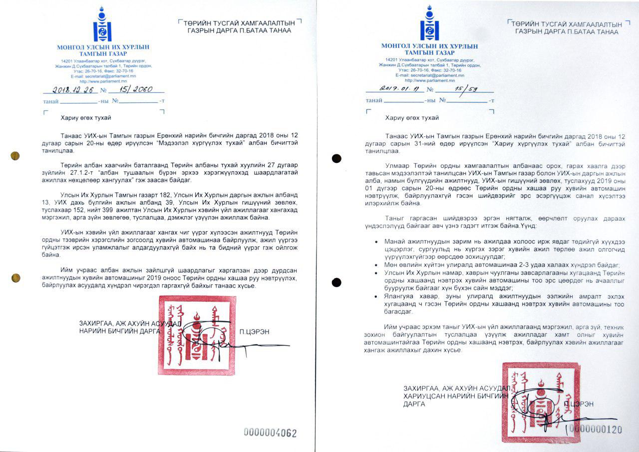 Тиймээс ажлын нөхцөл, зайлшгүй шаардлагыг харгалзан үзэхийг хүссэн албан бичгийг УИХ-ын Тамгын газраас Төрийн тусгай хамгаалалтын газрын дарга П.Батаад хоёр удаа явуулж, хэлтэс, алба, ажилтнууд удаа дараа санал хүсэлтээ илэрхийлсээр байгаа ч асуудал шийдэгдэхгүй байсаар хориглосон шийдвэр хэрэгжиж эхлээд байгаа аж.