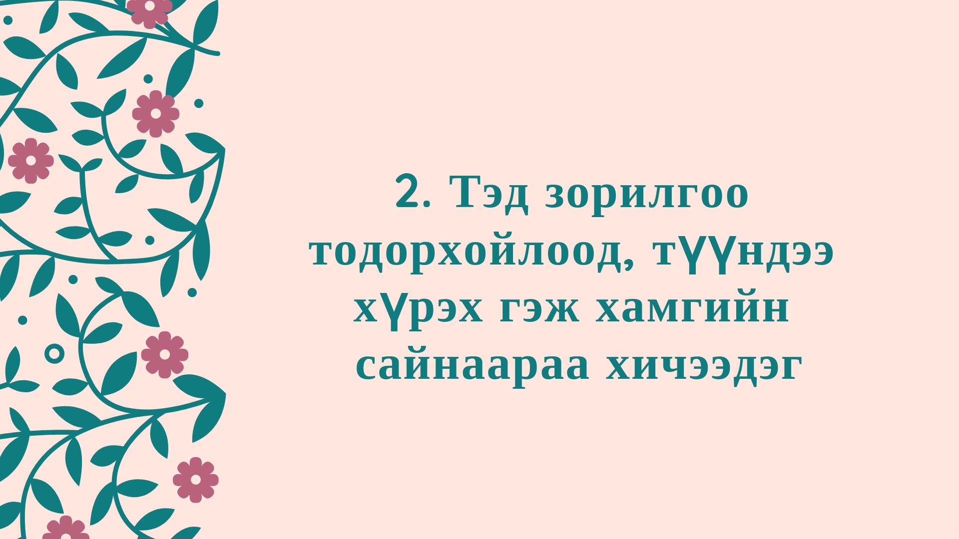 Зорилго том, жижиг байхаас үл хамааран тэд хамгийн сайнаараа хичээдэг. Эхлээд жижиг зорилгуудаас эхэлж түүндээ хүрсний дараа томоохон зорилгуудыг өмнөө тавьдаг. Таны "хэн бэ" гэдгийг зорилго тодорхойлох  учир энэ нь маш чухал юм.