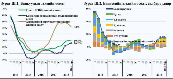 Харин 2017 оны сүүлийн хагасаас эхлэн хөрөнгийн дотогшлох урсгал нэмэгдэж, бодит эдийн засгийн өсөлт сэргэсэнтэй холбоотойгоор зах зээлд оролцогчдын хүлээлт сайжирсан. Түүнчлэн энэ үед Мөнгөний бодлогын хорооны шийдвэрээр мөнгөний бодлогын хүүг шат дараалан бууруулсны зэрэгцээ хэрэглээний зээлийн өр, орлогын харьцаа болон зээлийн дээд хугацаанд хязгаарлалт тогтоох арга хэмжээг 2019 оны нэгдүгээр сарын 1-нээс эхлэн хэрэгжүүлэхээр шийдвэрлэсэн. Дээрх нөхцөл байдал, бодлогын арга хэмжээтэй уялдан бизнесийн зээлийн өсөлт 2018 оны II улирлаас эхлэн сэргэж 2018 оны 10 дугаар сарын байдлаар 16.1 хувьд хүрээд байна. Энэ нь худалдаа, уул уурхай, барилга, боловсруулах салбарт голчлон ажиглагдаж байна. Эдгээр салбарт олгосон бизнесийн зээл нэмэгдэхийн хэрээр боловсруулах, худалдаа, уул уурхайн салбарын үйлдвэрлэл сүүлийн улирлуудад нэмэгдсэн гэж Төв банкны мэдээлэлд дурдсан байна.