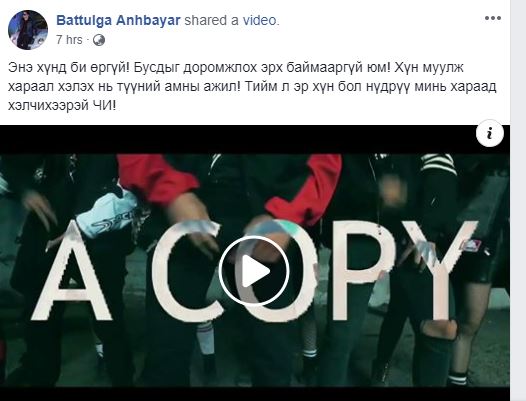 Тэрбээр, "Реппер Gee буюу Т.Мөнх-Эрдэнэ гэдэг хүнийг ойлгохгүй юм. Уран бүтээлээрээ дамжуулан маш олон хүнийг доромжилж байна. Уран бүтээл хийх гээд явж байгаа залуучуудыг доромжилж, доош нь хийдэг. Үүнийгээ уран бүтээл гэж нэрлэдэг. Үүнд би харамсч байна. Чи яагаад урлагийн хүмүүсийг, уран бүтээлчдийг доромжилдог юм бэ. Үүнийг маш олон хүүхдүүд сонсож байгаа. Тэд хичээж байгаа уран бүтээлчдийн талаар буруу ойлголт авч байгаа. Монголын хүүхдүүдэд чи хараал зааж өгсөн шүү. Тулааны талбай дээр эр хүн шиг нударгаараа үзээд үнэн, худлаа ярилцаад, чи надад тийм л дургүй юм бол тулааны талбайд уураа гарга. Чамаас айх юм алга. Зүгээр байхад доромжилсон хүн нь чи шүү” хэмээсэн байна.