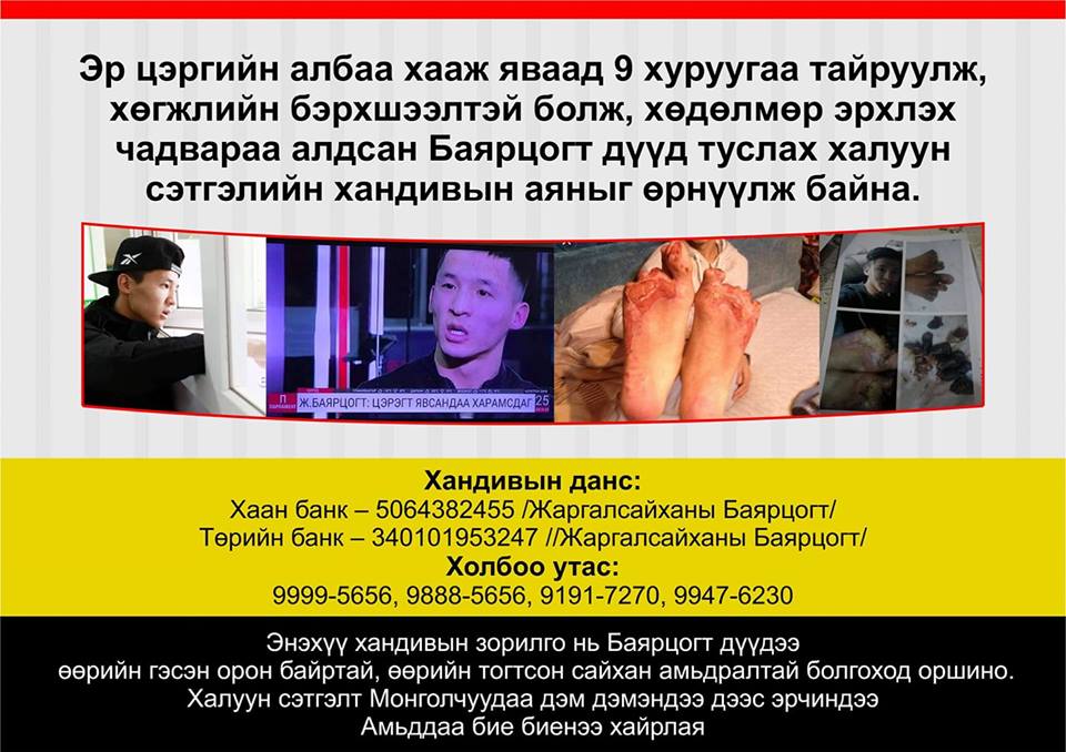 Харин эр цэргийн алба хааж яваад эрэмдэг болсон Ж.Баярцогтод, дуучин, соёлын тэргүүний ажилтан Э.Энх-Эрдэнэ туслахын тулд хандивын аян эхлүүлжээ. Хандивыг хаан банкны 5064382455, Төрийн банкны 34010195324, Жаргалсайханы Баярцогт гэсэн дансанд төвлөрүүлэх бөгөөд цугларсан мөнгийг Ж.Баярцогтыг орон гэртэй болгоход зарцуулах юм байна.