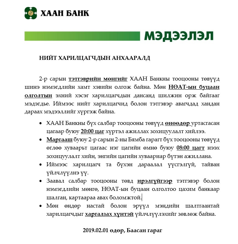 Хаан банкнаас НӨАТ-ын буцаан олголт болон хоёдугаар сарын тэтгэвэр олголтын тухай мэдээллийг гаргасан байна. Хаан банкны бүх салбар тооцооны төвүүд өнөөдөр уртасгасан цагаар буюу 20.00 цаг хүртэл ажиллахаар болжээ. Мөн маргааш буюу хоёрдугаар сарын 2-ны өдөр бүх тооцооны төвүүд 08.00-20.00 цаг хүртэл ажиллах юм байна.