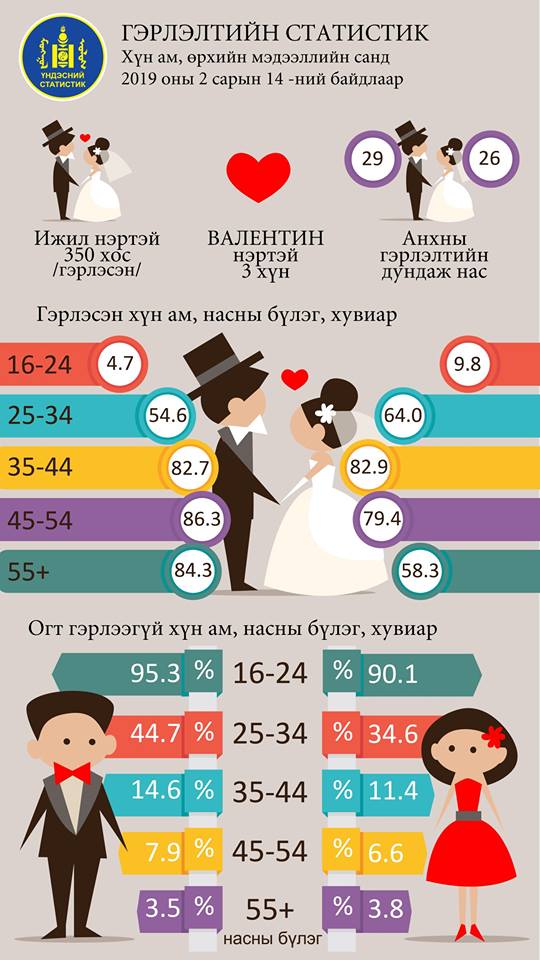 Монгол Улсын хүн амын анхны гэрлэлтийн дундаж нас эрэгтэй 29, эмэгтэй 26 байна.