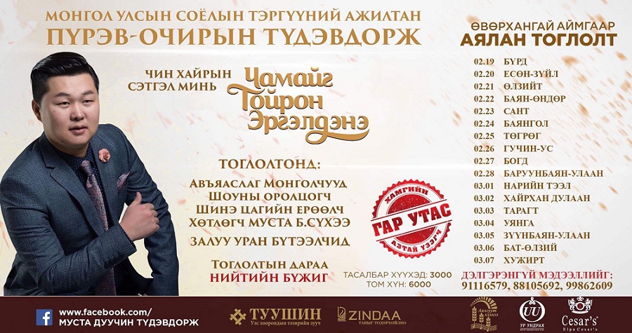 Маргаашнаас /2019.02.19/ төрсөн нутаг Өвөрхангай аймгийнхаа зарим сумдад “Чамайг тойрон эргэлдэнэ” уран бүтээлийн тайлан тоглолтоо хийх гэж байна. Өвөрхангай аймгийн Бүрд, Есөнзүйл, Өлзийт, Баян-Өндөр, Сант, Баянгол, Төгрөг, Гучин-Ус, Богд, Баруунбаян-Улаан, Нарийнтээл, Хайрхандулаан, Тарагт, Уянга, Зүүнбаян-Улаан, Бат-Өлзий, Хужирт сумдад тоглоно.