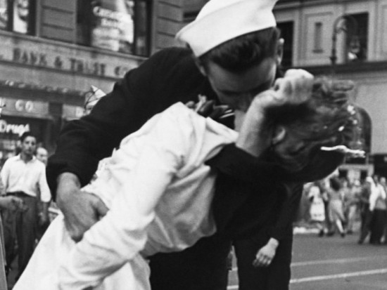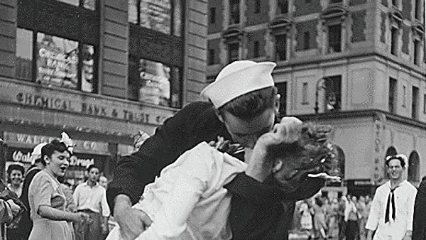 1945 оны наймдугаар сарын 14-ний өдөр буюу Япон улс бууж өгөх нөхцөлийг хүлээн авсны дараа Нью-Йорк хотын оршин суугчид гудамжинд гарч, баярлацгаах үед Жорж Мендонс сувилагчийн дүрэмт хувцас өмссөн Грета Фридманыг анзаарч, санамсаргүй үнссэн нь гэрэл зургийн дуранд өртөж, мөнхлөгджээ. Гэрэл зургийг Альфред Эйзенштайн гэгч гэрэл зурагчин авсан бөгөөд анх “Life” сэтгүүлд хэвлэгдэн гарч байжээ.