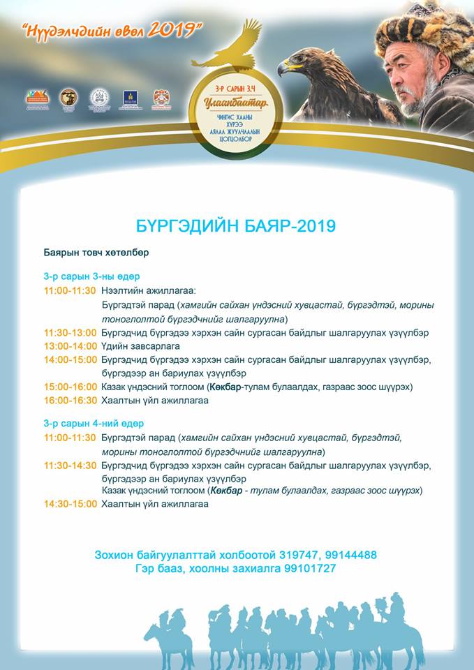 Бүргэдээр ан хийх уламжлал, зан заншлыг сэргээх, хойч үеийнхэнд өвлүүлэн үлдээх, дотоод гадаадын жуулчдад сурталчлан аялал жуулчлалын бүтээгдэхүүн болгохоор “Нүүдэлчдийн өвөл 2019 – Бүргэдийн баяр” арга хэмжээг ирэх гуравдугаар сарын 3-4-ний өдрүүдэд “Чингис Хааны Хүрээ” аялал жуулчлалын цогцолборт зохион байгуулах гэж байна.