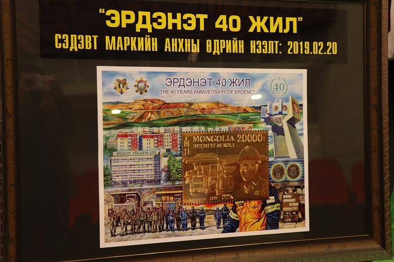 “Эрдэнэт үйлдвэр” ХХК-ийн түүхт 40 жилийн ойд зориулан 90 гаруй жилийн түүхтэй “Монгол шуудан” компаниас “Эрдэнэт-40” тусгай технологи бүхий алтан марк гаргажээ. Алтан маркийн анхны хувийг “Эрдэнэт үйлдвэр” ХХК-д хүлээлгэн өгөх ёслол өнөөдөр /2019.02.20/ боллоо.