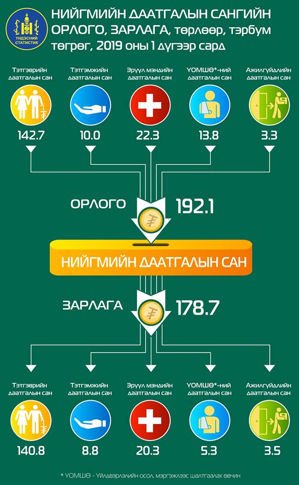 Нийгмийн даатгалын ерөнхий газар болон Эрүүл мэндийн даатгалын ерөнхий газрын мэдээллээр нийгмийн даатгалын сангийн орлого энэ оны нэгдүгээр сард 192.1 тэрбум төгрөг болж, өмнөх оны мөн үеэс 50.3 тэрбум төгрөгөөр, зарлага 178.7 тэрбум төгрөг болж, өмнөх оны мөн үеэс 29.7 тэрбум төгрөгөөр өсчээ.