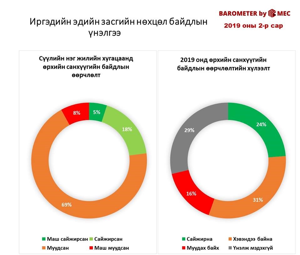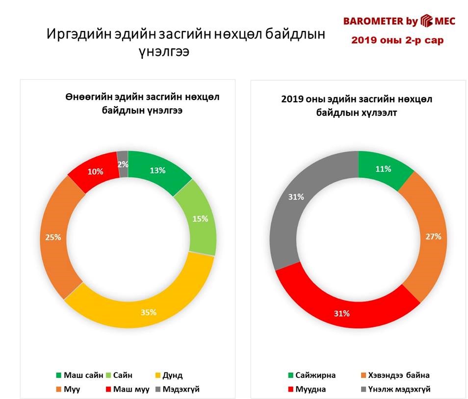 2019 оны эдийн засгийн нөхцөл байдлын хүлээлтийг тандахад судалгаанд оролцсон иргэдийн 11 хувь нь САЙЖИРНА гэсэн хүлээлттэй байгаа бол 31 хувь нь МУУДНА гэж таамаглажээ.