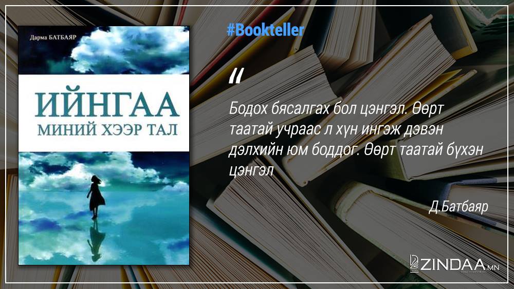 Тус зохиолд залуу хосын хайр сэтгэл хийгээд монгол түмний байгалиа шүтэх ёс заншил, түүнээс улам алсран холдсоор буй суурин амьдралын бараан сүүдэр хүмүүсийг хэрхэн дайрч буйг өгүүлдэг. "Ийнгаа миний хээр тал" бол хүмүүний дотоод сэтгэл, эрх чөлөөний дуулал болсон бодрол тууж юм. Залуу хүмүүсийн амьдралын утга учир, итгэл үнэмшлийн тухай ойлголтын ч тус туужид өгүүлэх болно. Зохиолч Д.Батбаярын "Ийнгаа миний хээр тал" туужаас онцлон 10 эшлэлийг хүргэе.