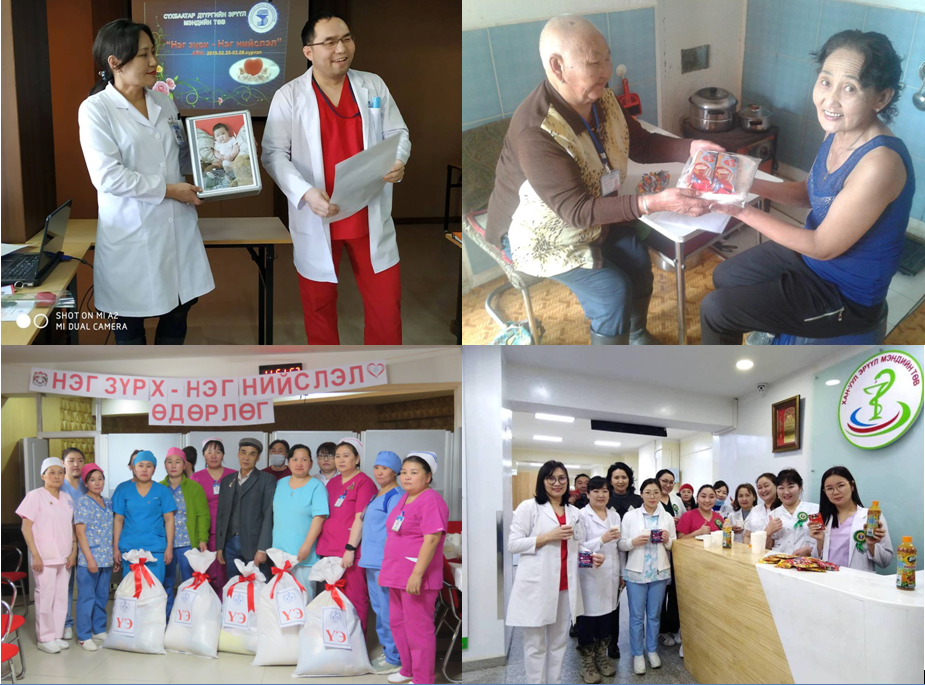 Тухайлбал, Баянзүрх дүүргийн нэгдсэн эмнэлгийн хувьд өрх толгойлсон, олон хүүхэдтэй, хөгжлийн бэрхшээлтэй, нийгмийн халамж шаардлагатай эмч, ажиллагсадаа урьдчилан сэргийлэх үзлэг шинжилгээнд хамруулж, Сэргээн засах болон уламжлалт эмчилгээ хийлгэх эрхийн бичиг олгож, нэг сарын хүнсний хэрэглээг нь хандивлажээ. Сүхбаатар дүүргийн эрүүл мэндийн төвийн хувьд гадаадад эмчлүүлэх шаардлагатай гурав болон найман сартай хоёр хүүхдэд мөнгөн тусламж үзүүлснээс гадна хөгжийн бэрхшээлтэй хоёр үйлчлүүлэгчийг сувилалд хэвтүүлэн эмчлүүлэхээр болсон байна.
