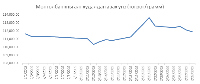 2019 оны хоёрдугаар сард 1 грамм алт худалдан авах Монголбанкны дундаж үнэ 111,748.31 төгрөг байлаа.