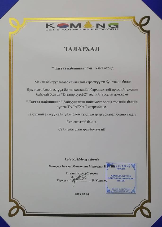 Энэхүү төсөлтэй "Тагтаа Паблишинг"-ийн хамт олон хамтарч эхэлсэн байна. Өмнөд Солонгос дахь монголчууд "Тагтаа Паблишинг"-ийн номыг хямдралтай үнээр худалдан авч, үйл ажиллагаанд дэмжлэг үзүүлэх аж.