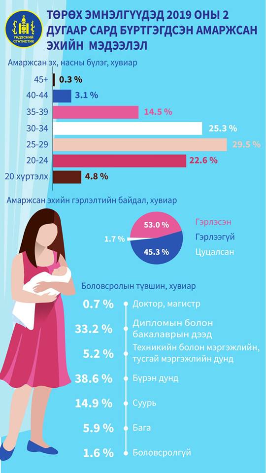 Улсын хэмжээнд энэ оны эхний 2 сард 11 752 эх амаржиж, 11 825 хүүхэд төрүүлжээ. Өмнөх оны мөн үеэс амаржсан эх 188 буюу 1.6 хувиар, амьд төрсөн хүүхэд 192 буюу 1.6 хувиар буурсан байна. Харин хоёрдугаар сард 5796 эх амаржиж, 5824 хүүхэд төрүүлсэн нь өмнөх сараас амаржсан эх 160 -аар, амьд төрсөн хүүхэд 177 -гоор буурчээ.