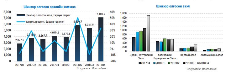 Шинээр олгосон зээлийн хэмжээ өмнөх улирлаас 34 хувиар өсч 7.1 их наяд төгрөгт хүрсэн байна. 2017 оны дөрөвдүгээр улирлаас 2018 оны нэгдүгээр улиралд дунджаар 3.6 их наяд төгрөгийн зээл шинээр гаргаж байсан бол сүүлийн 3 улиралд дунджаар 6.1 их наяд төгрөгийн зээлийг шинээр гаргасан байна. Шинээр олгосон зээлийн 24 хувийг цалин, тэтгэврийн зээл, 8 хувийг хадгаламж барьцаалсан зээл, 5 хувийг картын зээл эзэлж байна. Эдийн засгийн өсөлт сайн байгаатай холбоотой банкуудын зээл олголт 2018 онд огцом нэмэгджээ.