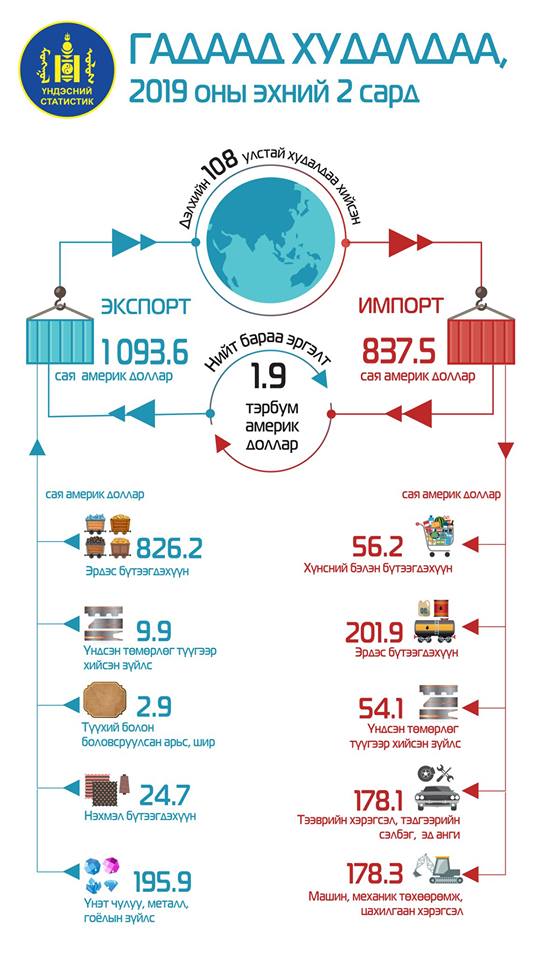 Манай улс энэ оны эхний 2 сард дэлхийн 108 улстай худалдаа хийж, гадаад худалдааны нийт бараа эргэлт 1.9 тэрбум ам.доллар болов. Үүнээс экспорт 1.1 тэрбум ам.доллар, импорт 837.5 сая ам.долларт хүрлээ.