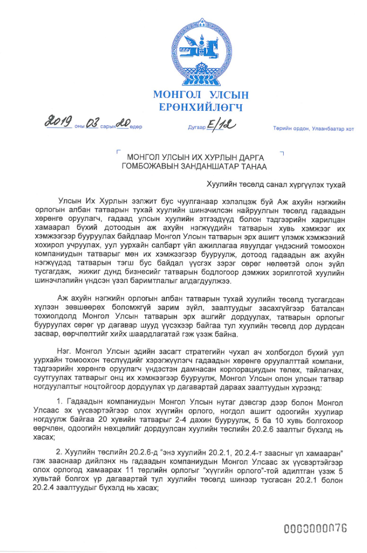 “…Энэхүү хуулийн төсөлд гадаадын хөрөнгө оруулагч, гадаад улсын хуулийн этгээдүүд болон тэдгээрийн харилцан хамаарал бүхий дотоодын аж ахуйн нэгжүүдийн татварын хувь хэмжээг их хэмжээгээр бууруулах байдлаар Монгол Улсын татварын эрх ашигт үлэмж хэмжээний хохирол учруулах, уул уурхайн салбарт үйл ажиллагаа явуулдаг үндэсний томоохон компаниудын татварыг мөн их хэмжээгээр бууруулж, дотоод гадаадын аж ахуйн нэгжүүдэд татварын тэгш бус байдал үүсгэх зэрэг сөрөг нөлөөтэй олон зүйл тусгагдаж, жижиг дунд бизнесийг татварын бодлогоор дэмжих зорилготой хуулийн шинэчлэлийн үндсэн үзэл баримтлалыг алдагдуулжээ…” гэж үзсэн тул хуулийн төсөлд саналаа хүргүүлэв.