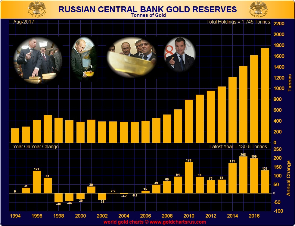 Мөн  Орос, Казахстан, Турк зэрэг улс орнуудын худалдан авалт өссөн. Оросын Төв банк 2017 онд 223 тонн алтаар нөөцөө нэмэгдүүлсэн. 2018 оны алтны худалдан авалтад жин дарах нөлөөг мөн үзүүлж байна. Тус улсын Төв банк алтны худалдан авалтаа нэмэгдүүлж, эдийн засгаа тогтворжуулж, рублийн ханшийнхаа дархлааг дэмжиж байна.  Харин Оросын араас Туркийн төв банкны худалдан авалт бичигдэж таарах нь. 187.7 тонн алт худалдаж авсан нь,  21.8 хувиар нөөцөө нэмэгдүүлсэн үзүүлэлт. Тэгвэл Туркийн дараа Хятадын худалдан авалтын хэмжээг тодотгоё. Тус улсын Ардын банкны алтны нөөц 2017 оны эцсийн байдлаар 1842.6 тонн болсон байгаа юм. Хятад улсын тухайд ам.долларын цэвэр нөөцөөрөө бол дэлхийд нэгдүгээрт бичигдэж ирсэн. Гэхдээ валютаараа алт худалдан авах бодлогыг барих болсон юм.