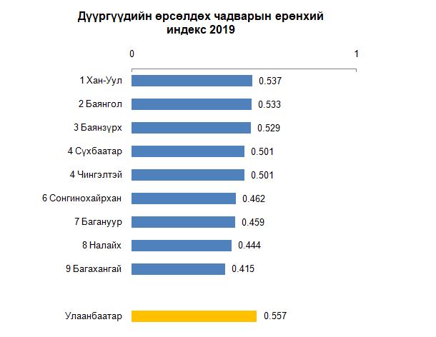 Улаанбаатар хотын болон 9 дүүргийн өрсөлдөх чадварыг хэмжих, үнэлэх, цаашлаад иргэдийн оролцоог хангасан, өргөн хүрээтэй мэдээллийн сан бий болгох зорилгоор Эдийн засгийн бодлого, өрсөлдөх чадварын судалгааны төвөөс /ЭЗБӨЧСТ/ судалгаа хийдэг. Дүүргүүдийн өрсөлдөх чадварыг 2017 оноос анх судалж эхэлсэн ба судалгааг хоёр жил тутамд боловсруулж, өрсөлдөх чадварын өөрчлөлт, чиг хандлагыг судалж байгаа аж. Энэ хүрээнд хоёрдахь тайлангаа Азийн сангийн дэмжлэгтэйгээр гүйцэтгэснээ /2019-03-21/  танилцууллаа. Дүүргүүдийн өрсөлдөх чадварыг хэмжихдээ амьдралын чанар, амьдрах орчин, аюулгүй байдал, засаглал, эдийн засаг гэсэн таван үндсэн бүлгийн хүрээнд нарийвчлан тодорхойлсон нийт 150 шалгуур үзүүлэлтээр хэмждэг байна. Эдгээр шалгуур үзүүлэлтүүдийн мэдээллийг цуглуулахдаа Улаанбаатар хотын 9 дүүргийг хамарсан түүвэр судалгааг явуулж өрхийн асуулгаар мэдээлэл цуглуулсан ба дүүргүүдийн албан ёсны статистик мэдээллийг мөн ашиглажээ. Дүүргүүдийн өрсөлдөх чадварын шалгуур үзүүлэлтүүдийг ашиглан өрсөлдөх чадварын индексийг Улаанбаатар хот болон 9 дүүрэг тус бүрийн хувьд тооцдог. Дүүргүүдийн өрсөлдөх чадварын индекс нь 0-1 хооронд утга авахба 0 бол өрсөлдөх чадвар сул, 1 бол өрсөлдөх чадвар өндөр гэж ойлгож болно.  Энэ удаагийн судалгааны үр дүнгээр Улаанбаатар хотын өрсөлдөх чадварын ерөнхий индекс 0.557 оноотой үнэлэгдсэн байна. Өрсөлдөх чадварын оноогоор Хан-Уул, Баянгол, Баянзүрх дүүргүүд тэргүүлж байгаа бол алслагдсан дүүргүүд болох Багануур, Багахангай, Налайх дүүргүүд бусад дүүрэгтэй харьцуулахад өрсөлдөх чадвар сул байна.