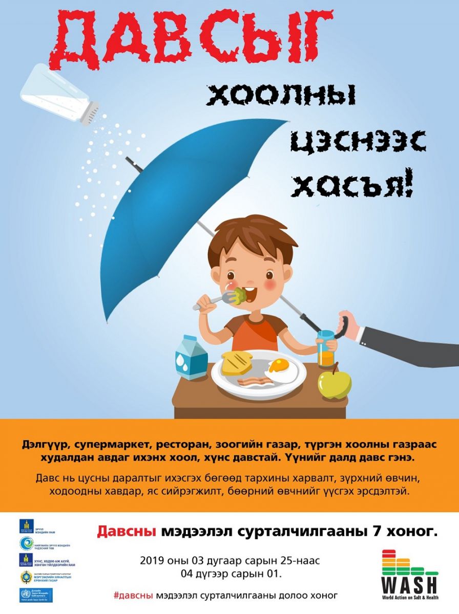 НҮБ-аас дэлхийн хүн амын давсны хэрэглээг бууруулахаар зорилт тавьсан бөгөөд энэ жилийн тухайд хоолны давс, ялангуяа хүүхдэд өгч буй хоол хүнсний давсыг багасгах, улмаар хоолны орцноос хасах асуудалд анхаарал хандуулж байна. ЭМЯ, ХХААХҮЯ, БСШУСЯ, МХЕГ болон НЭМҮТ хамтран “Давсыг хоолны цэснээс хасъя” уриан дор мэдээлэл, сурталчилгааг олон нийтэд хүргэж байгаа бөгөөд хоолыг давсаар биш цагаан гаа, гоньд, улаан, ногоон сонгино зэрэг байгалийн гаралтай амтлагчаар амтлах, цайг давсгүй хэрэглэх, давсалсан, нөөшилсөн бүтээгдэхүүнээс татгалзаж давсны хэрэглээгээ багасгахыг уриалж байна.