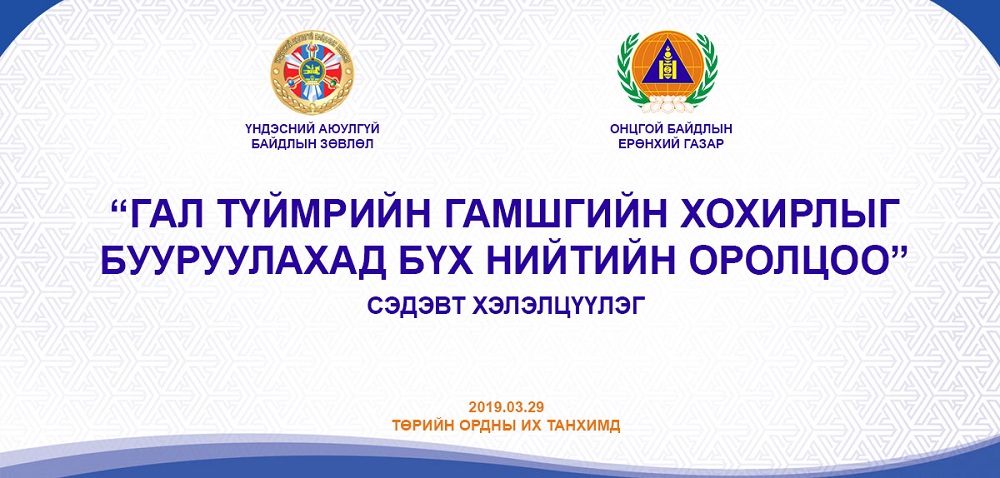 Монгол Улсын Ерөнхийлөгчийн ивээл дор Үндэсний аюулгүй байдлын зөвлөл, Онцгой байдлын ерөнхий газраас хамтран “Гал түймрийн гамшгийн хохирлыг бууруулахад бүх нийтийн оролцоо” сэдэвт хэлэлцүүлгийг маргааш буюу 2019 оны 03 дугаар сарын 29-ний 09:00 цагт Төрийн ордны их танхимд зохион байгуулах гэж байна.