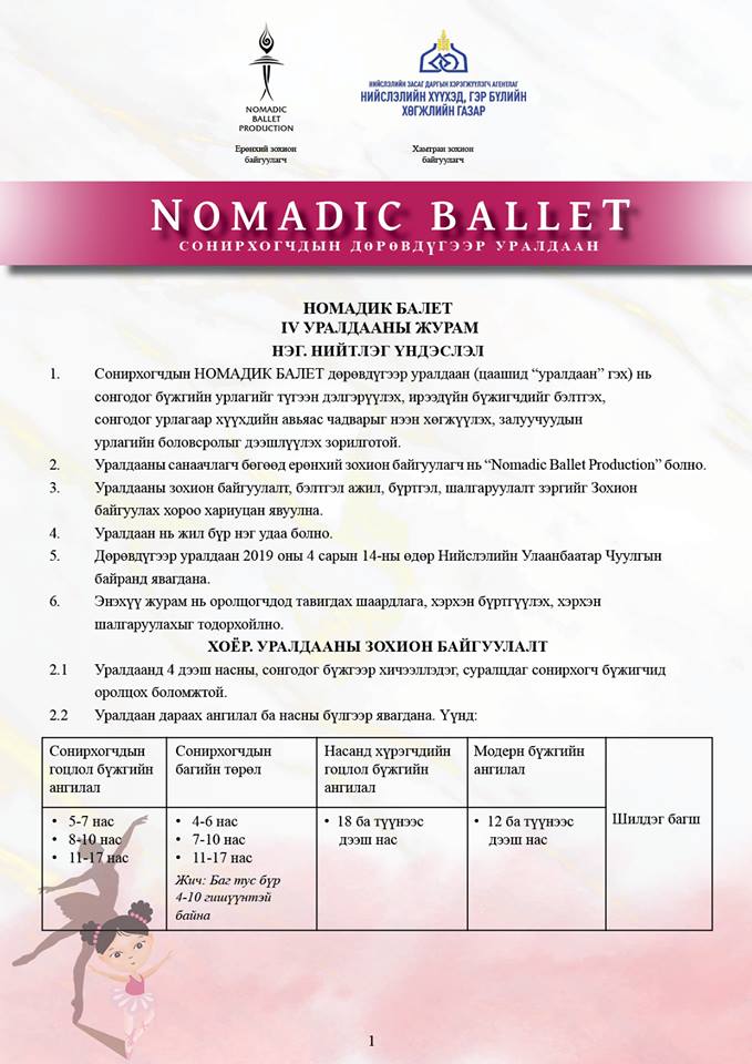 "Номадик Балет" продакшн, Нийслэлийн хүүхэд гэр бүл хөгжлийн газартай хамтран "Номадик Балет" сонирхогчдын дөрөвдүгээр уралдааныг зарлажээ. "Номадик Балет" уралдаан нь сонгодог урлагаар дамжуулан хүүхдийн авьяас чадврарыг нээн хөгжүүлэх, хүүхэд залуучуудад урлагийн боловсрол олгох зорилготой