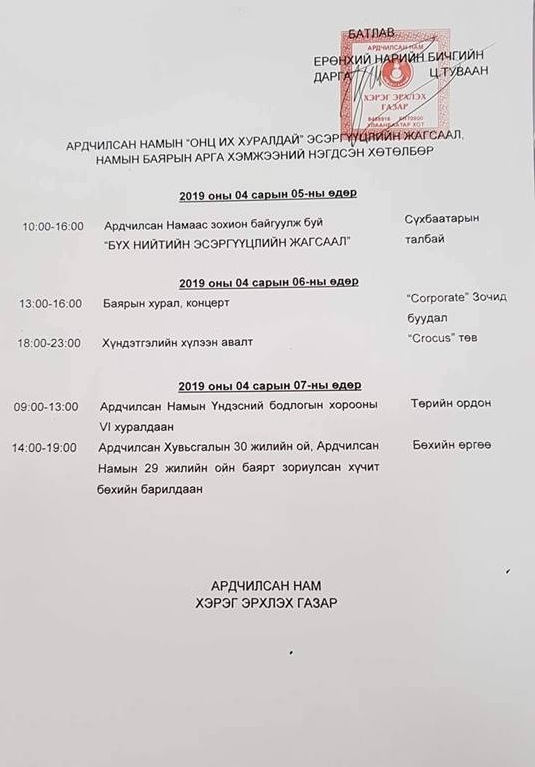 Ардчилсан хувьсгалын 30 жилийн ой, Ардчилсан нам үүсгэн байгуулагдсаны 29 жилийн ойг дохиолдуулан хэд хэд арга хэмжээг зохион байгуулах гэж байна. Эсэргүүцлийн цуглааныг энэ сарын 5-нд Сүхбаатарын талбайд зохион байгуулах бол энэ сарын 7-нд Үндэсний бодлогын хороо хуралдуулахаар болжээ. Мөн "Монгол-Ардчиллын баянбүрд" олон улсын хурлыг зохион байгуулах юм байна.