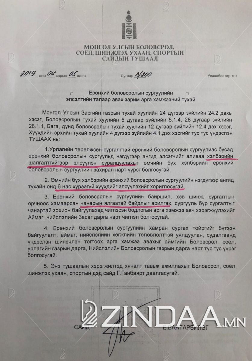 - Урлагийн төрөлжсөн сургалттай Ерөнхий боловсролын сургуулиас бусад Ерөнхий боловсролын сургуульд нэгдүгээр ангид элсэгчийг аливаа хэлбэрийн шалгалтгүйгээр элсүүлэн суралцуулахыг өмчийн бүх хэлбэрийн Ерөнхий боловсролын сургуулийн захирал нарт даалгав.