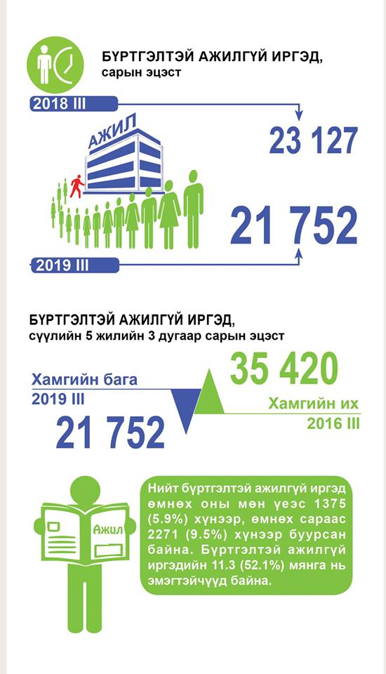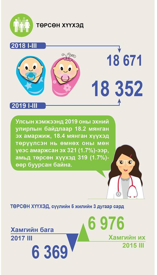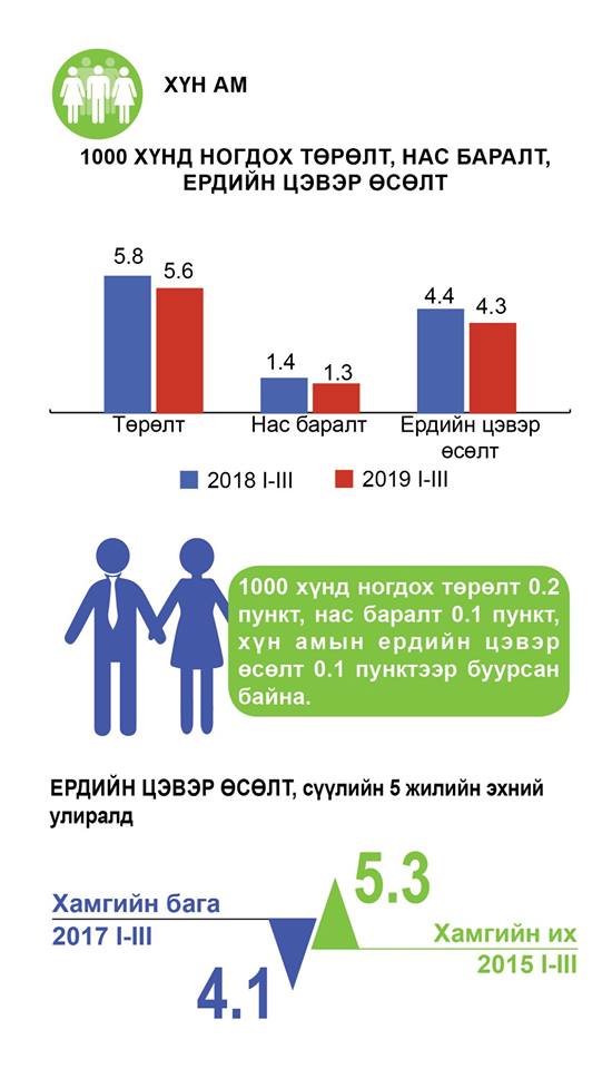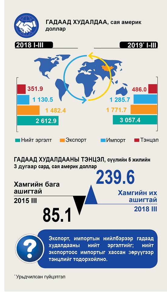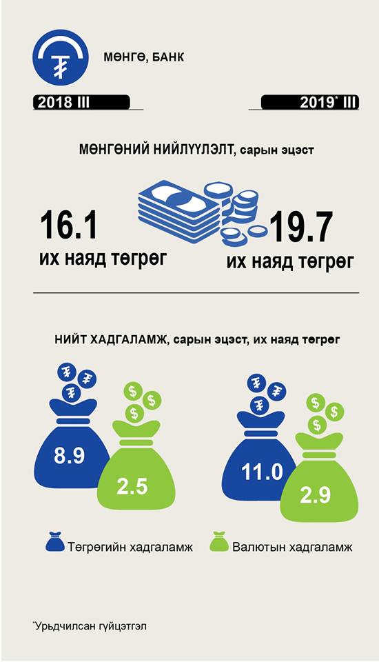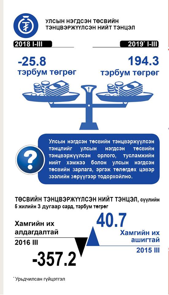Монгол Улсын нийгэм, эдийн засгийн байдлын эхний 3 сарын зарим тоон мэдээллийг инфографикаар хүргэж байна. Үндэсний статистикийн хорооны мэдээллээр Мөнгөний нийлүүлэлт 2019 оны гуравдугаар сарын эцсээр 19.7 их наяд төгрөг, инфляцийн жилийн өөрчлөлт 6.7 хувь, төсвийн тэнцвэржүүлсэн нийт тэнцэл 194.3 тэрбум төгрөг гарчээ.