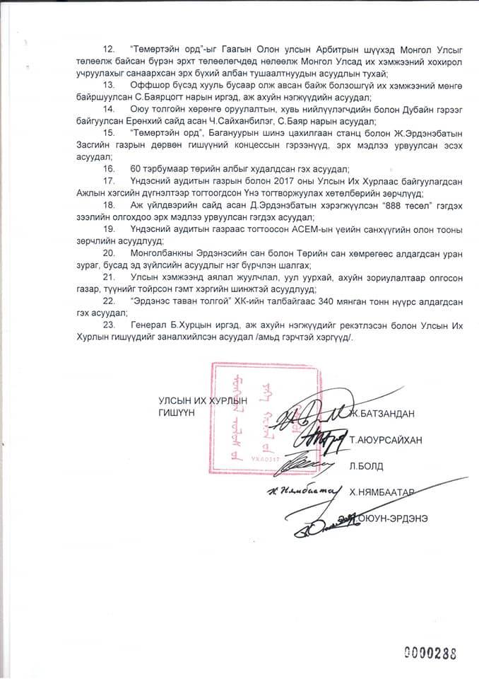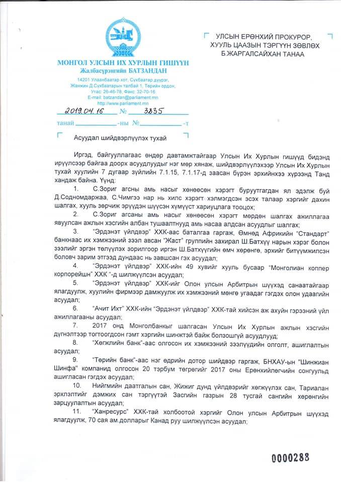 УИХ-ын гишүүн Ж.Батзандан, Л.Оюун-Эрдэнэ, Х.Нямбаатар, Л.Болд, Т.Аюурсайхан нар Монгол Улсын Ерөнхий прокурор, хууль цаазын тэргүүн зөвлөх Б.Жаргалсайханд хандан албан тоот илгээжээ. Албан тоотод дурьдаснаар, “Иргэд, албан байгууллагаас өндөр дамтамжтайгаар гишүүд бидэнд ирүүлсээр байгаа асуудлуудыг нэг мөр хянан шийдвэрлүүлэхээр УИХ-ын тухай хуулийн 7 дугаар зүйлийн 7.1.15, 7.1.17-д заасан бүрэн эрхийнхээ хүрээнд Танд хандаж байна” гэжээ.