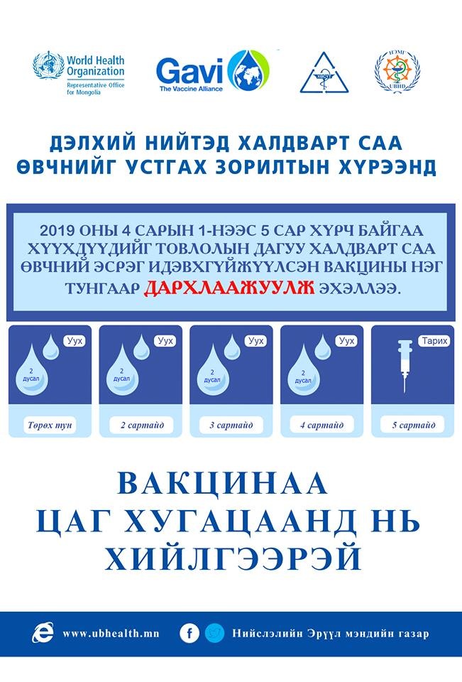 Халдварт саа өвчнийг дэлхий нийтэд устгах зорилтын хүрээнд Эрүүл мэндийн сайдын 2019 оны А/119 дүгээр тушаалын дагуу халдварт саагийн эсрэг идэвхигүйжүүлсэн вакцинаар 05 сартай хүүхдийг дархлаажуулах арга хэмжээг энэ сарын 01-ний өдрөөс эхлэн улсын хэмжээнд зохион байгуулж байгаа билээ.