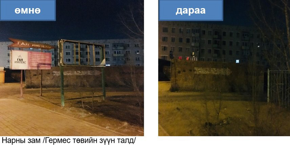 Энэ ажлын хүрээнд Энхтайваны өргөн чөлөө буюу МҮЭСТО-ы зүүн хойно байрлуулсан сурталчилгааны самбар, Чингисийн өргөн чөлөө буюу Энхтайваны гүүрийн зүүн болон баруун хойно байрлуулсан самбар, Энгелсийн гудамж буюу “Алтай” хотхоны зүүн талын, “Нарны зам” дагуух “Гермес” төвийн зүүн талын, мөн Чингүнжавын гудамжинд байрлуулсан самбар гээд журам зөрчсөн 10 гаруй самбарыг буулгаад байна.