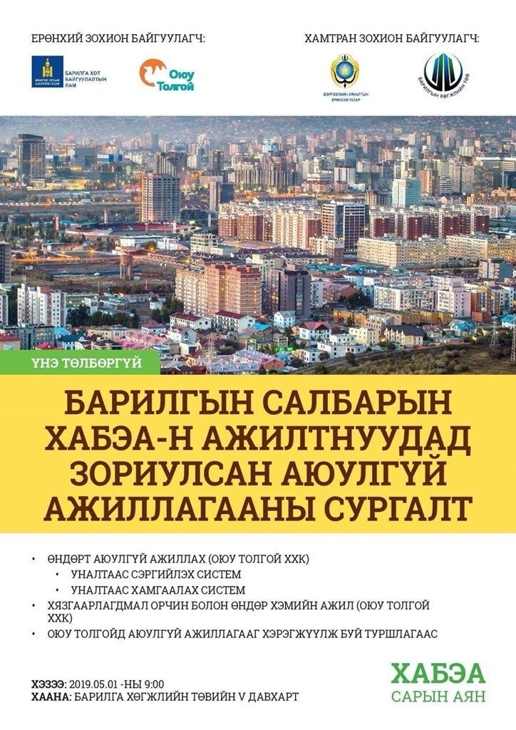 Тэгвэл БХБЯ, Оюутолгой ХХК-тай хамтран явуулж буй барилгын салбарын ХАБЭА-н хоёр дахь удаагийн сургалтыг тавдугаар сарын 1-ны өдөр зохион байгуулах гэж байна. Сургалтанд Төрийн болон Аж ахуйн нэгж байгууллагын Хөдөлмөрийн аюулгүй байдал, эрүүл ахуйн ажилтан, инженер техникийн ажилтнууд, удирдах албан тушаалтнууд хамрагдах юм.