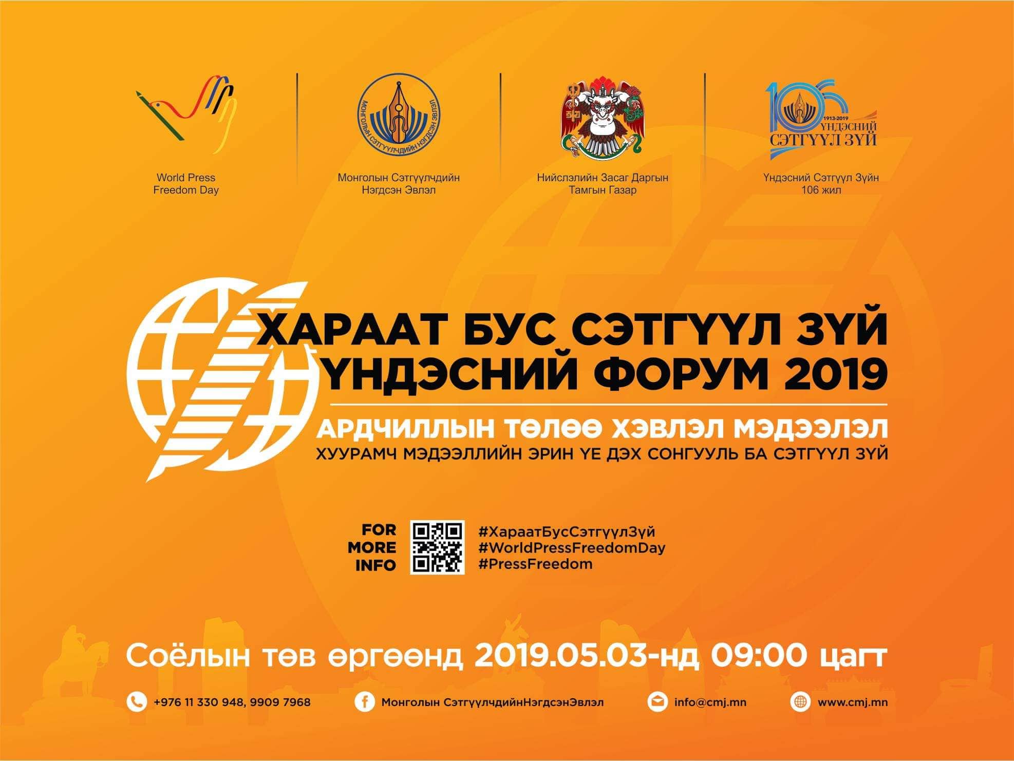 Дэлхийн хэвлэлийн эрх чөлөөний өдрийг тохиолдуулан Монголын сэтгүүлчдийн нэгдсэн эвлэлээс "Хараат бус сэтгүүл зүй" үндэсний форумыг “Ардчиллын төлөө хэвлэл мэдээлэл, Хуурамч мэдээллийн эрин үе дэх сонгууль ба сэтгүүл зүй” уриан дор зохион байгуулах гэж байна.