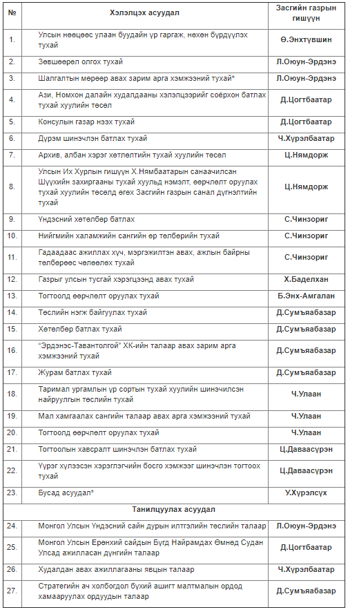 Долоо хоног бүрийн лхагва гарагийн 08.00 цагт Засгийн газрын ээлжит хуралдаан болдог. Тэгвэл энэ удаагийн Засгийн газрын ээлжит хуралдаанаар нийт 27 асуудал хэлэлцэн шийдвэрлэхээр төлөвлөжээ.