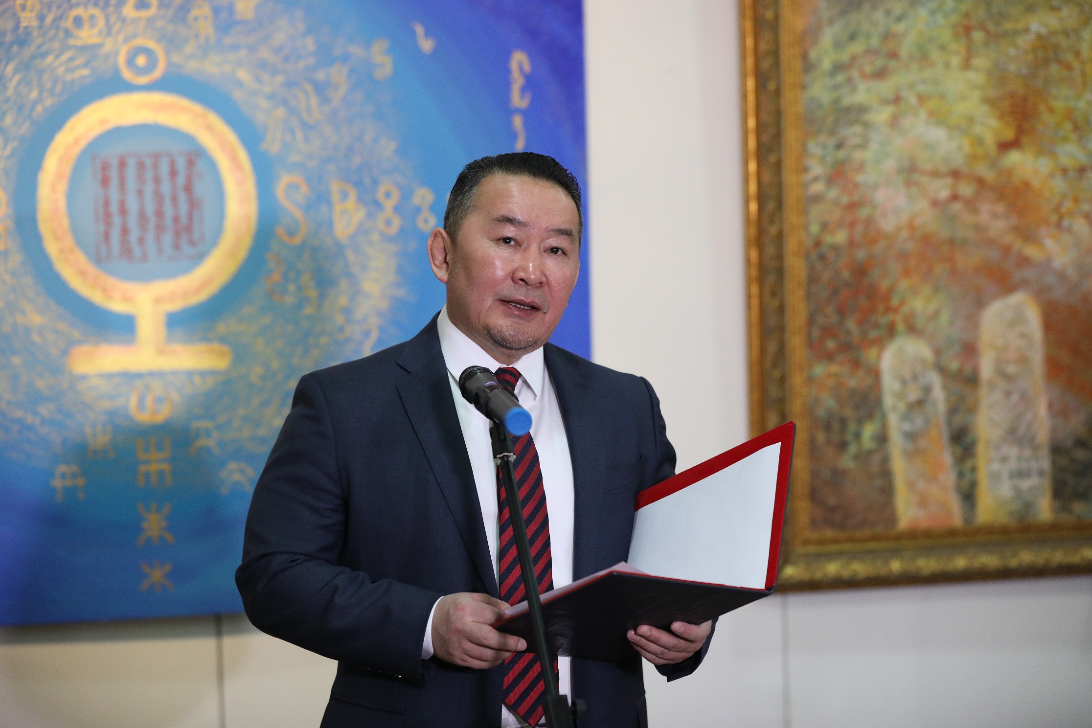 Монгол Улсын Ерөнхийлөгч Х.Баттулга үг хэлснийхээ дараа үзэсгэлэнгийн нээлтэд ирсэн хүмүүстэй хамт бүтээлүүдийг үзэж сонирхов.