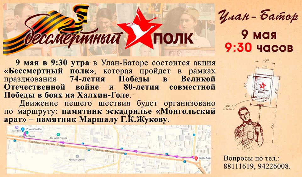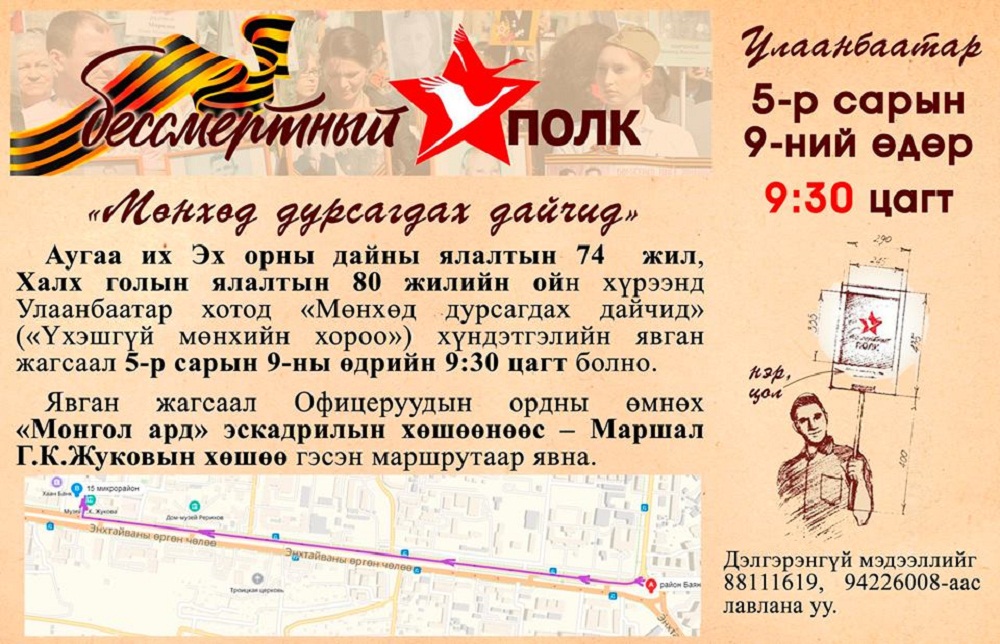 Аугаа их Эх орны дайны ялалтын 74 жил, Халх голын ялалтын 80 жилийн ойн хүрээнд энэ сарын 9-нд “Мөнхөд дурсагдах дайчид” (Үхэшгүй мөнхийн хороо) хүндэтгэлийн явган жагсаал болох гэж байна. Жагсаал тавдугаар сарын 9-ний 9:30 цагт эхлэх аж. Явган жагсаал Офицеруудын ордоны өмнөх “Монгол ард” эскадрилын хөшөөнөөс маршал Г.К.Жуковын хөшөө гэсэн маршрутаар явна.