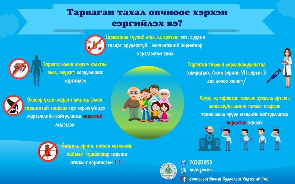 Тарвагатай харьцсан, бөөс бүүрэгт хазуулсан, халуурах, толгой өвдөх, дотор эвгүйрхэх, нүүр нүд улайх, булчин өвдөх зэрэг шинж тэмдэг илэрвэл ЗӨСҮТ-ийн 70282853, ХӨСҮТ-ийн 100 дугаарын утсанд яаралтай мэдэгдэнэ үү.