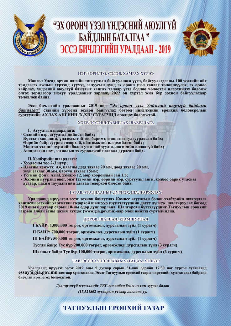 Эссэ бичлэгийн уралдааныг 2019 онд “Эх оронч үзэл Үндэсний аюулгүй байдлын баталгаа” сэдвийн хүрээнд зохион байгуулах бөгөөд нийслэлийн ерөнхий боловсролын сургуулийн ахлах ангийн /X-XII/ сурагчид оролцох боломжтой.