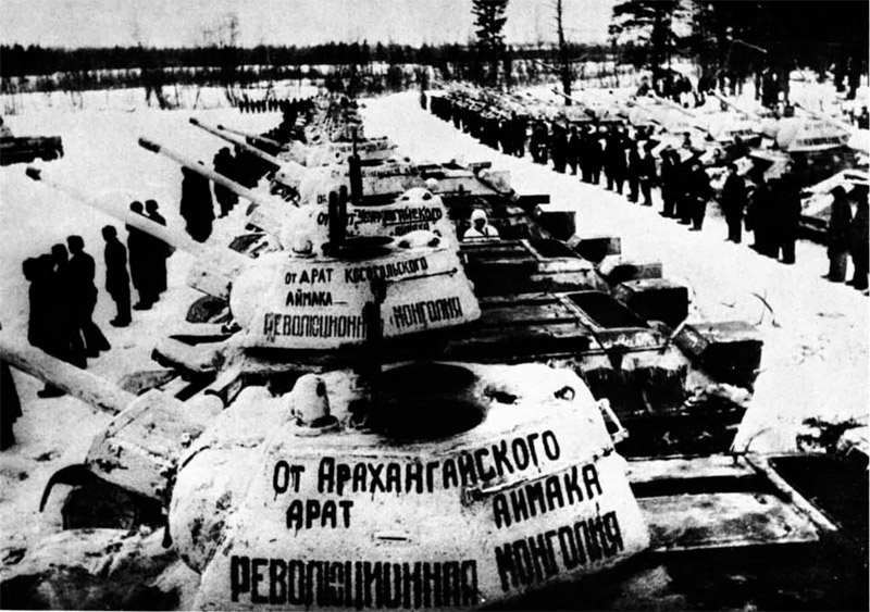 Монголчуудын тусламжийн хөрөнгөөр бүхэл бүтэн танкын цуваа байгуулсан. Бүх танк нь өөрийн нэртэй. “Ардын Их Хурал”, “БНМАУ-ын Сайд нарын Зөвлөл”, “Сүхбаатар”, “Маршал Х.Чойбалсан”, “Хатанбаатар Магсаржав”, “Монгол чекист”, “Монгол ард” гэсэн нэртэй танкууд Зөвлөлтийн армитай хамт чөлөөлөх дайнд оролцсон. Т-34 танк (32 ширхэг), Т-70 танк (21 ширхэг), Т-70 танк 5 ширхэг нийлүүлжээ.