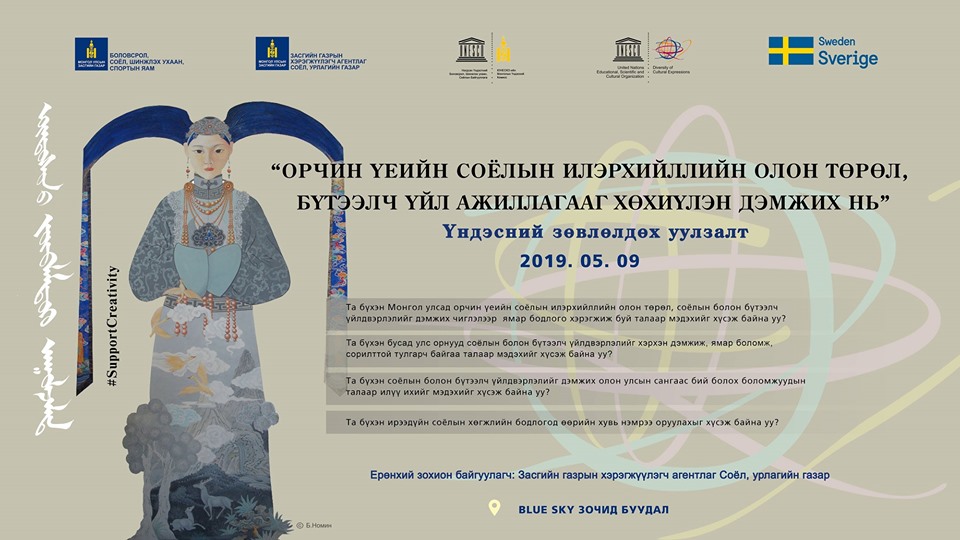 Засгийн газрын хэрэгжүүлэгч агентлаг, Соёл урлагийн газар Монгол Улсын соёлын болон бүтээлч үйлдвэрлэлийн өнөөгийн нөхцөл байдал, цаашдын чиг хандлагыг хэлэлцэх зорилгоор “Орчин үеийн соёлын илэрхийллийн олон төрөл, бүтээлч үйл ажиллагааг хөхиүлэн дэмжих нь’’ үндэсний зөвлөлдөх уулзалтыг 2019 оны маргааш буюу тавдугаар сарын 9-нд өдөр зохион байгуулах гэж байна.