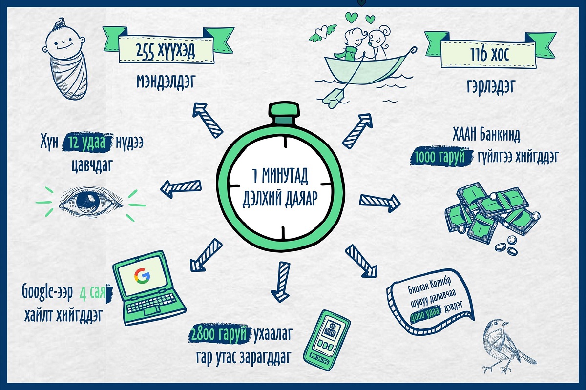 Дэлхий даяар нэг минутад юу болж өрнөдөг вэ? Минут тутам дэлхий дээр 255 хүүхэд мэндэлдэг бол 116 хос хуримладаг. Энэ богино хугацаанд хүн ойролцоогоор 12 удаа нүдээ цавчдаг бол бяцхан Колибр шувуу далавчаа 4000 удаа дэвдэг гэсэн сонирхолтой статистик бий. Мөн нэг минутад дэлхий даяар 2800 орчим ухаалаг гар утас зарагдаж, “Google”-ээр 4 сая хайлт хийгддэг ажээ.