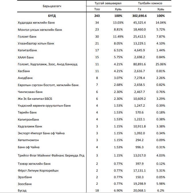 Тэгвэл 2018 оны арванхоёрдугаар сарын 1-ний өдрийн байдлаар нийт тусгай зөвшөөрлийн 243 нь Банк, банк бус санхүүгийн байгууллагуудын барьцаанд байгаа юм. Эдгээр тусгай зөвшөөрөл нь нийтдээ 302,690.6 га газарт олгогджээ.