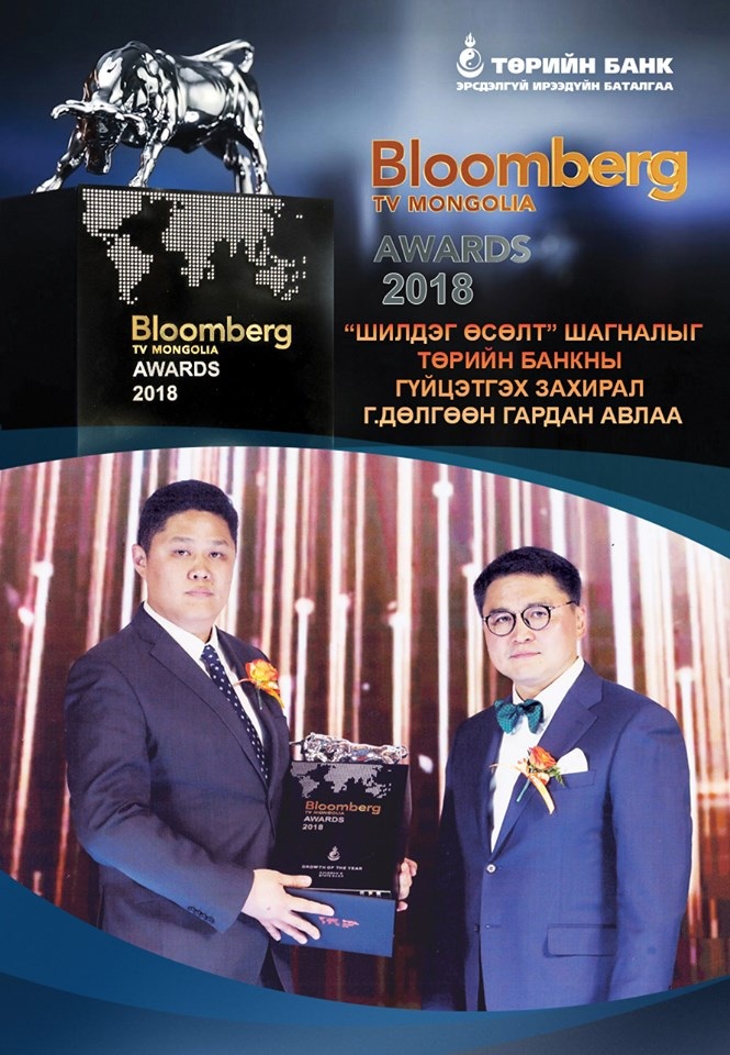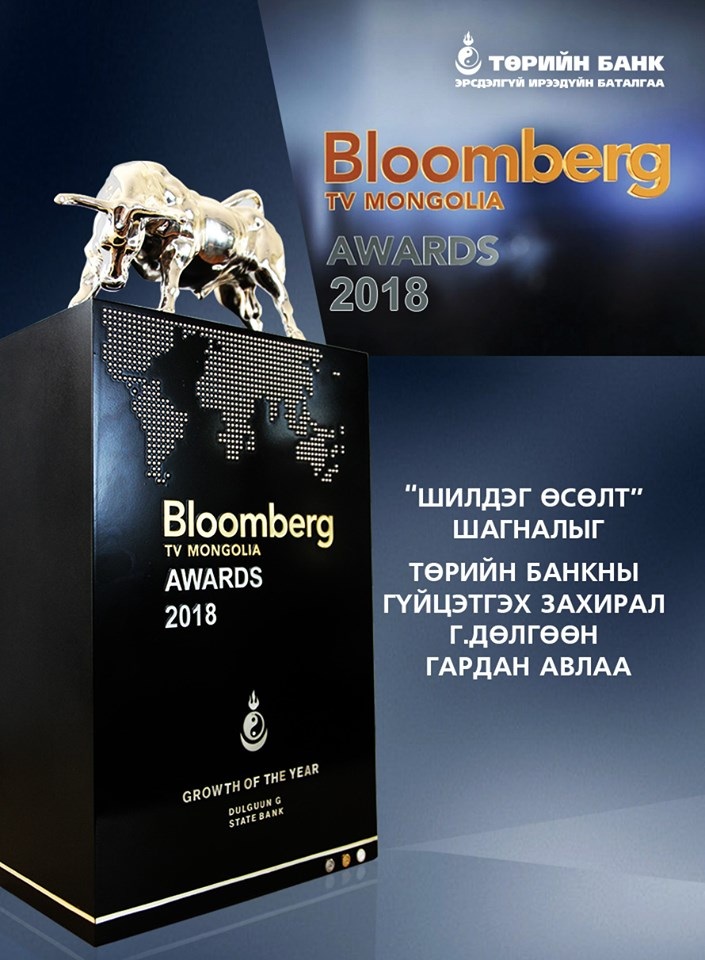 Бизнесийн шилдгүүдийг шалгаруулдаг “Bloomberg TV Mongolia Awards” зургаа дахь удаагаа боллоо. Тус арга хэмжээ нь Монгол Улсын хөгжилд бодитой хувь нэмэр оруулж эдийн засаг, бизнес, санхүүгийн салбарт хүлээн зөвшөөрөгдсөн шилдгүүдийг шалгаруулдаг нэр хүндтэй шагналын нэг юм. Тэгвэл энэ жилийн “Шилдэг Өсөлт” шагналыг Төрийн банкны Гүйцэтгэх захирал Г.Дөлгөөн гардан авлаа.